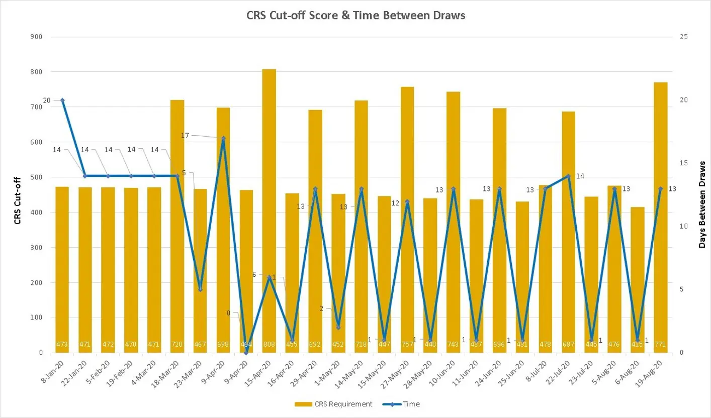 The time between draws is an important factor that can have an effect on the CRS cut-off score. Shorter intervals between draws mean fewer candidates have time to enter a profile in the Express Entry pool.
